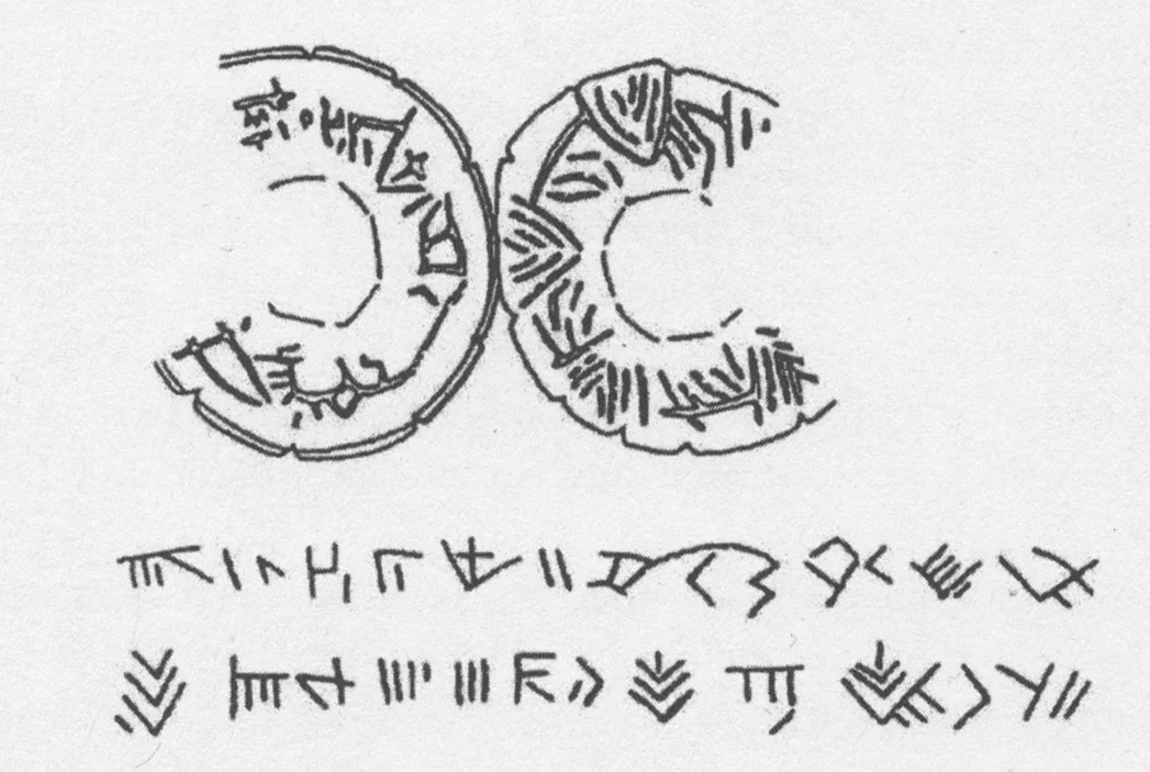 Kirjoitettu teksti ruukun pohjassa (Tisza-aluekulttuuri, Vanha Eurooppa; n. 4700–4500 eaa).